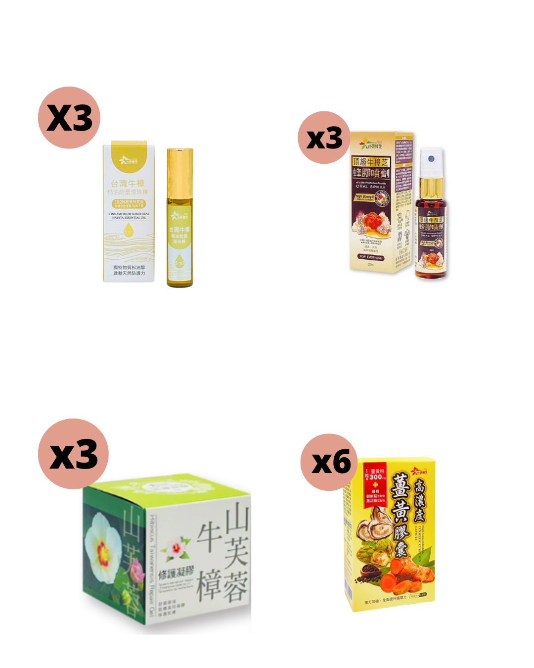 新台研薑黃膠囊 (30粒)x6 box, 牛樟芝蜂膠噴劑30ml x3 bottle, 牛樟山芙蓉修護凝膠60g x3 bottle 【FREE】牛樟山芙蓉修護凝膠60g x1 bottle, 牛樟精油滾珠瓶5ml x3 FREE 台灣牛樟精油滾珠瓶5ml x1