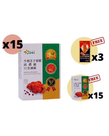 牛樟芝子實體滴錠2.5G X15 Box 【FREE】牛樟芝子實體滴錠2.5G X15 Box + 牛樟靈芝飲10包 X3 Box RM3,075.00