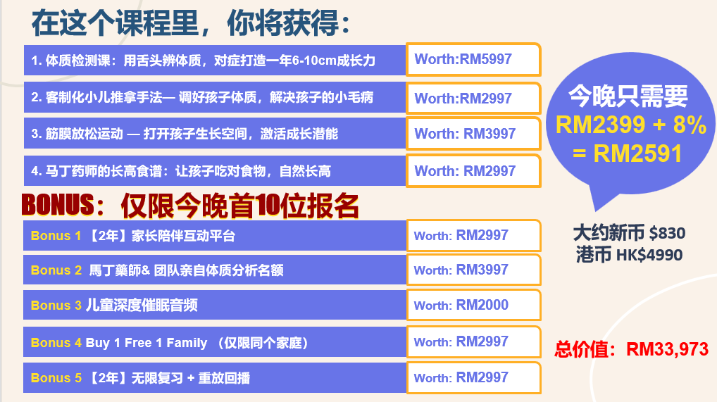 3天精英儿童长高班 RM2399 + 8% SST Total = RM 2591