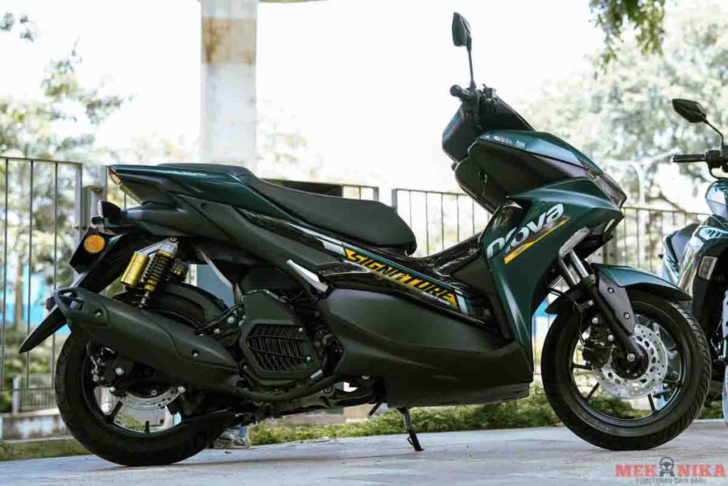 The Aveta Nova 160 is a 2025 liquid-cooled scooter in Malaysia featuring a 154.4 cc engine (15.8 hp/14.7 Nm), priced from RM7,988. It boasts a 10-litre fuel tank, 778 mm seat height, 112 kg weight, and 14-inch wheels. Key features include keyless start, ABS, USB charging, and an LED display