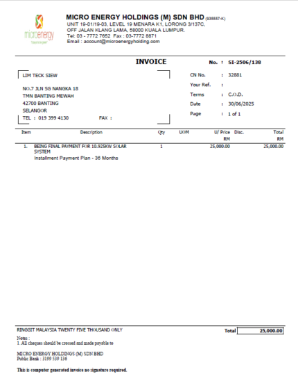 MICRO ENERGY HOLDINGS - Solar Installation Package RM25,000.00