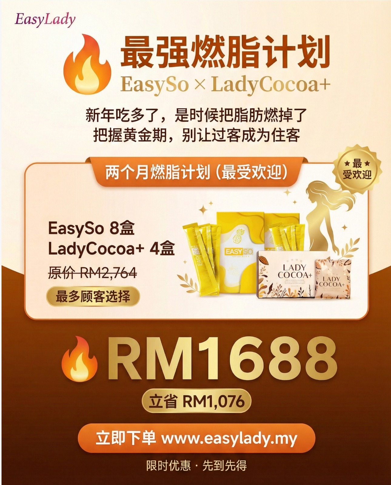 EasyLady EasySo Slimming Beverage 15 Sachets (12 Boxes) + EasyLady LadyCocoa+ Fat Burning Shake 14 Sachets (6 Boxes) Bundle RM2,388.00