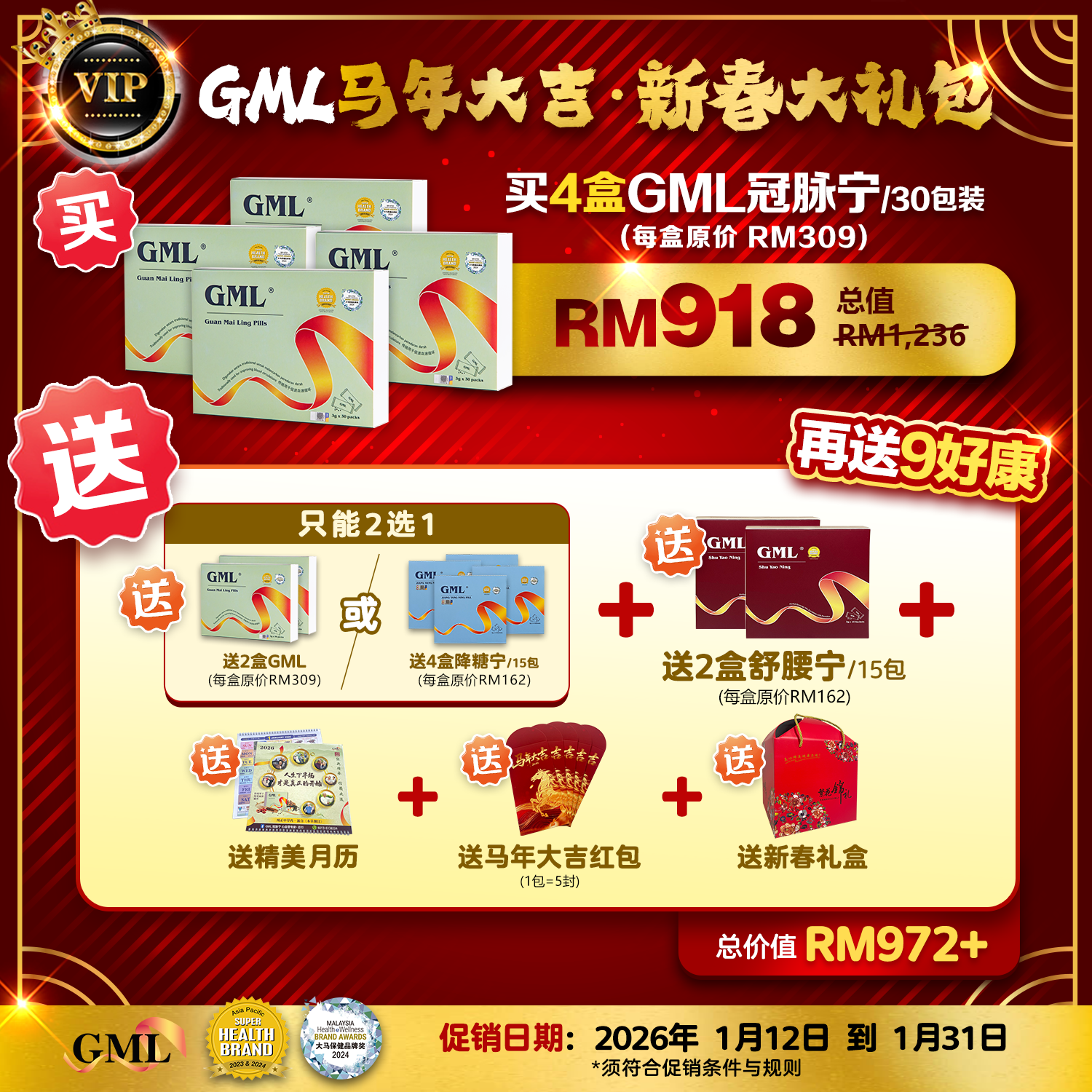 GML VIP Year Of The Horse Chinese New Year Gift Pack (1 Set) + Add-ons 50% Off: Choose Any 1 Option (4 Boxes Jiang Tang Ling / 4 Boxes An Gan Ning / 4 Boxes Shu Yao Ning)- East Malaysia GML VIP 马年大吉·新春大礼包(1套),另加其一(4盒降糖宁/4盒安肝宁/4盒舒腰宁)-东马