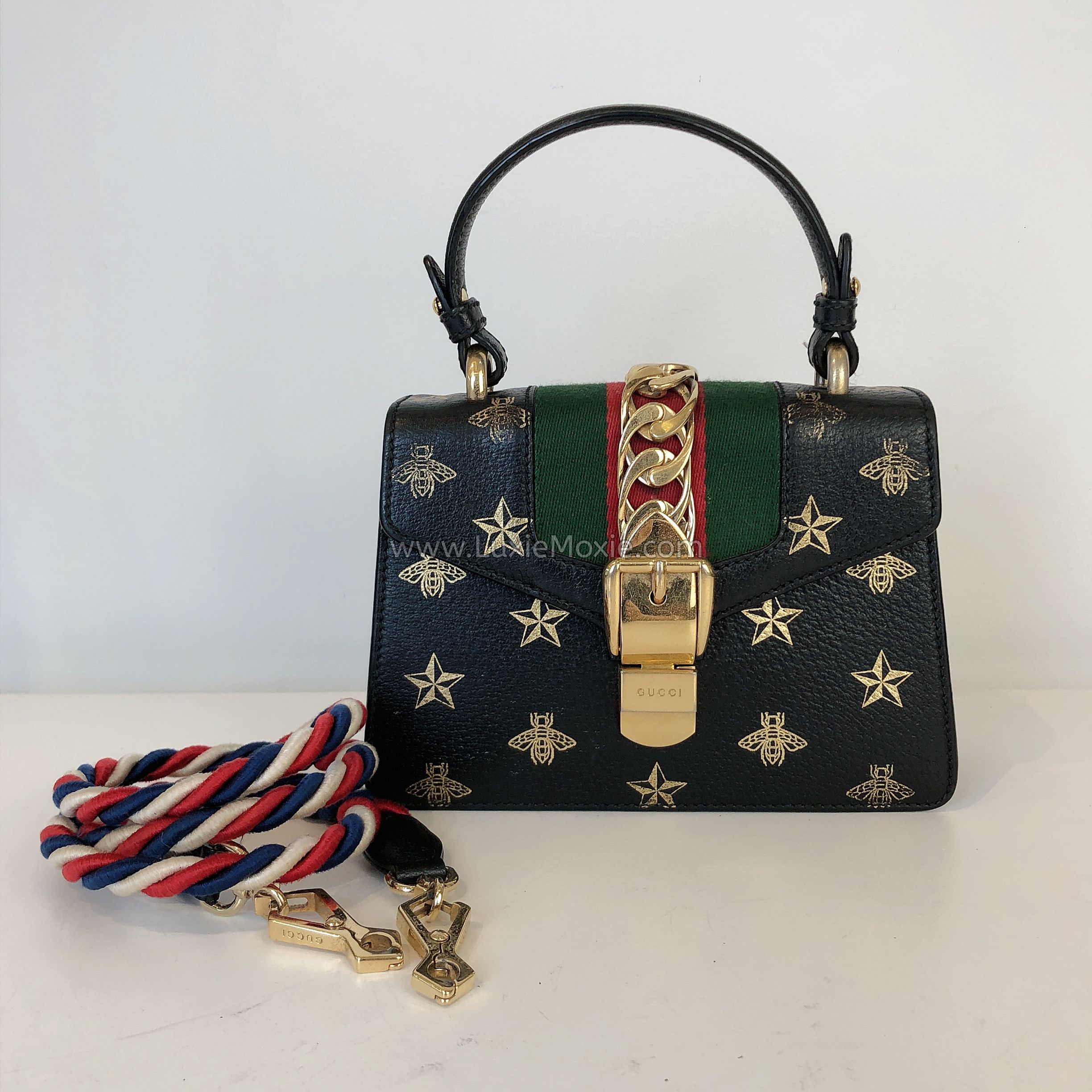 GUCCI Sylvie Mini Top Handle Bag in Black Calfskin with Bee & Star – GHW