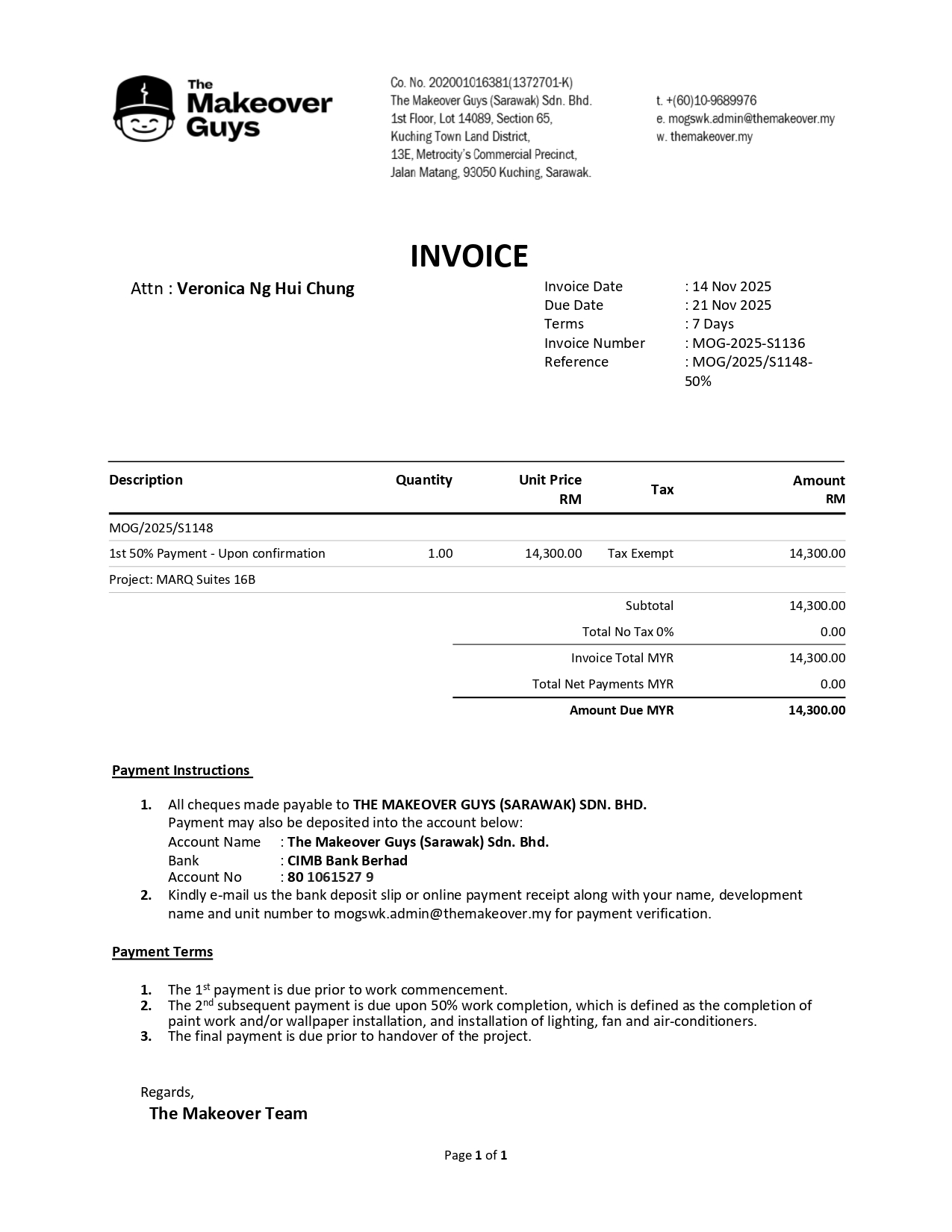 MAKEOVER GUYS – RENOVATION PACKAGE (1ST PAYMENT – UPON CONFIRMATION) – RESIDENTIAL NAME: MARQ SUITES 16B – CUSTOMER NAME: VERONICA NG HUI CHUNG