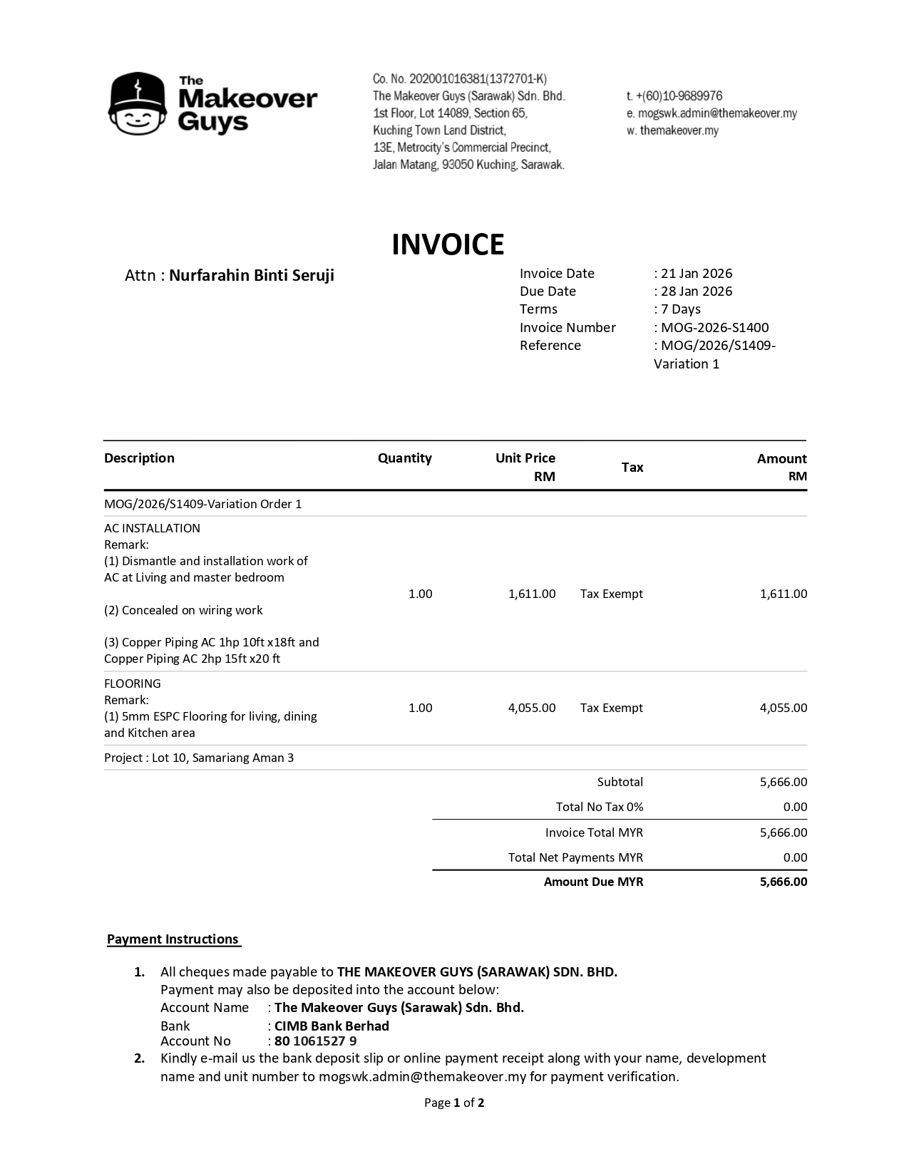 MAKEOVER GUYS – RENOVATION PACKAGE (VARIATION ORDER 1) | RESIDENTIAL NAME: LOT 10, SAMARIANG AMAN 3 | CUSTOMER NAME: NURFARAHIN BINTI SERUJI