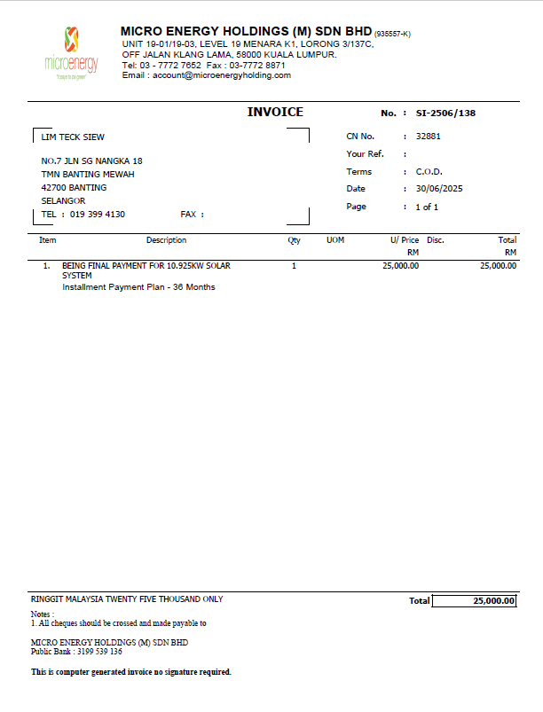 MICRO ENERGY HOLDINGS – Solar Installation Package